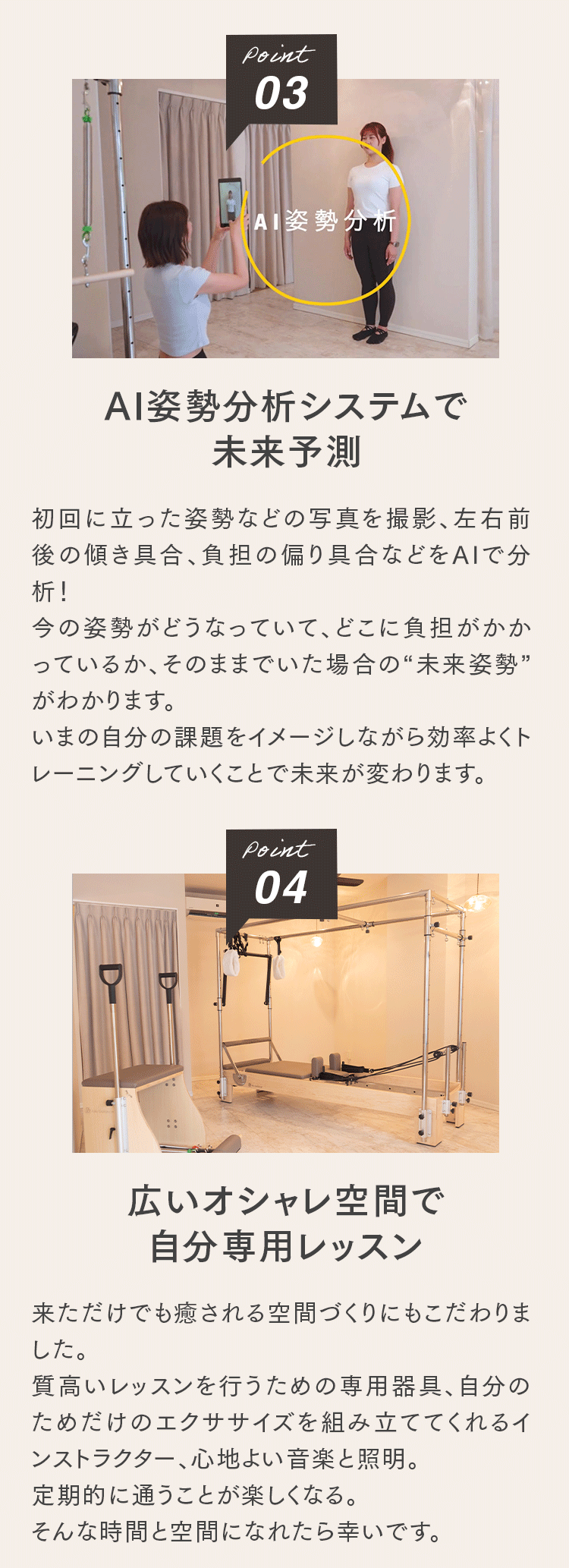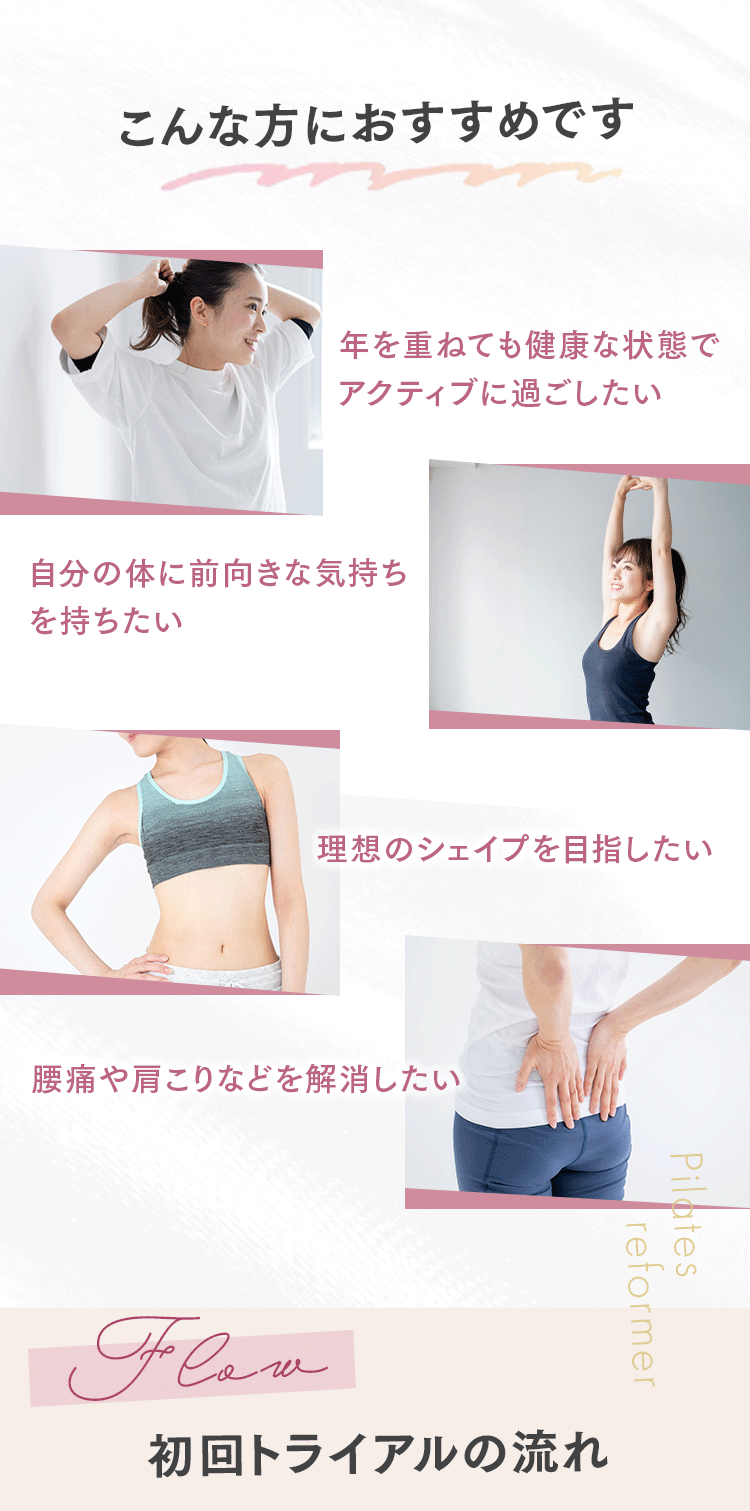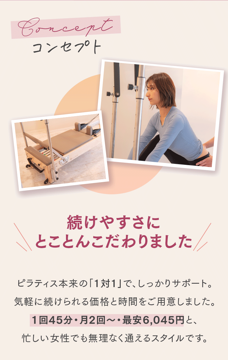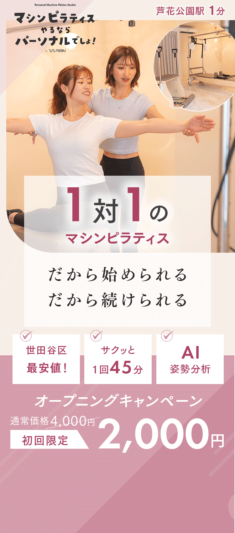 アクセス 芦花公園店 芦花公園駅1分。私らしく続けられる女性のためのマシンピラティス 住所:世田谷区南烏山1-30-3 1F 調布駅中央口1分 FAQ よくある質問 Q, マシンピラティスは初心者でもできますか? A, はい、ピラティスは初心者から上級者まで、年代含め幅広くご利用いただけます。専用のマシンを利用することで負荷なども調整可能ですので、安全にエクササイズを行うことができます。1つ1つの動きの中で経験豊富なインストラクターがサポートします。 Q, どのくらいの頻度でクラスを受けても大丈夫ですか? A,一般的に推奨されているのは週2回ペースですが、長く続けていただきたいという想いがあるので、まずは週1回からスタートしていただくのが良いかと思います。たくさん通いたい場合は追加チケット購入で週2回通うことも可能ですし、忙しくて毎週通うのが難しい方に向けて、月2回プランもご用意しております。無理ないペースで長く続けていただくのが大切と考えています。 Q, 体が硬いのですが、大丈夫ですか? A, そんな方こそご利用いただきたいです!ピラティスは柔軟性を高めるのにとても非常に効果的なエクササイズです。しなやかで、ヘルシーなカラダを目指しましょう! Q, 予約はどのようにできますか? A, ホームページの予約ページからいつでもご予約可能です。事前にチケットご購入の上、お好きな時間を選んでご予約ください。 Q, キャンセルポリシーはありますか? A, はい、キャンセルはご予約日、前日23:59まで可能です。それ以降のキャンセルではチケットが消化されますので、ご注意ください。 Q, 健康上の問題がある場合、参加できますか? A, 事前に医師にご相談し、インストラクターに現在の健康状態をお知らせください。ホームページ問い合わせからご連絡ください(LINEかメール)