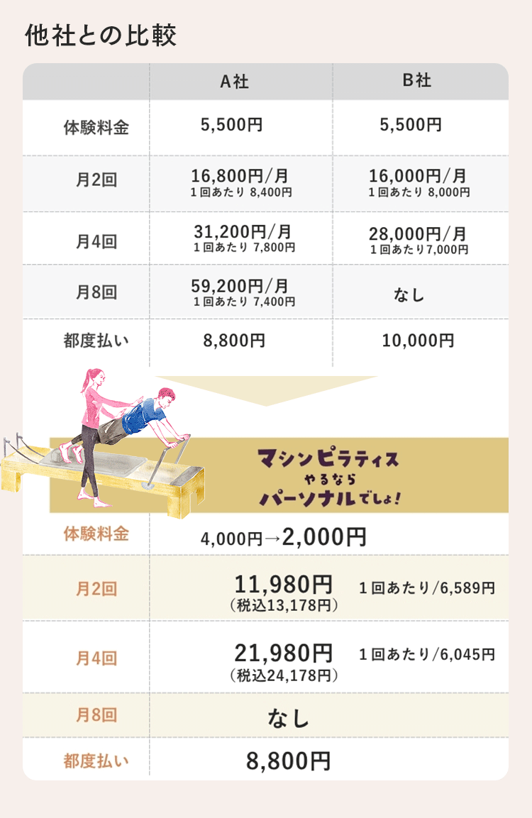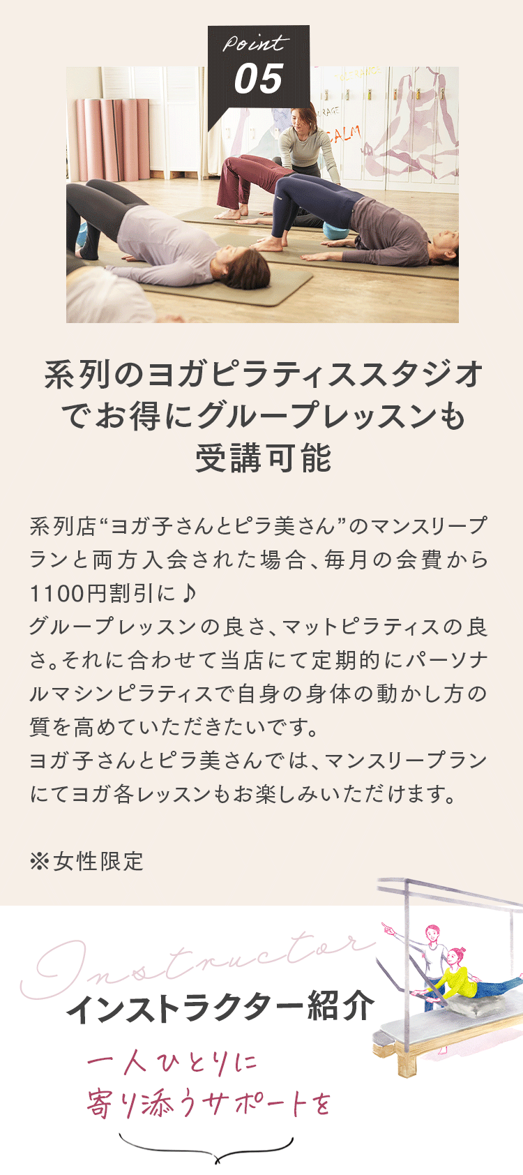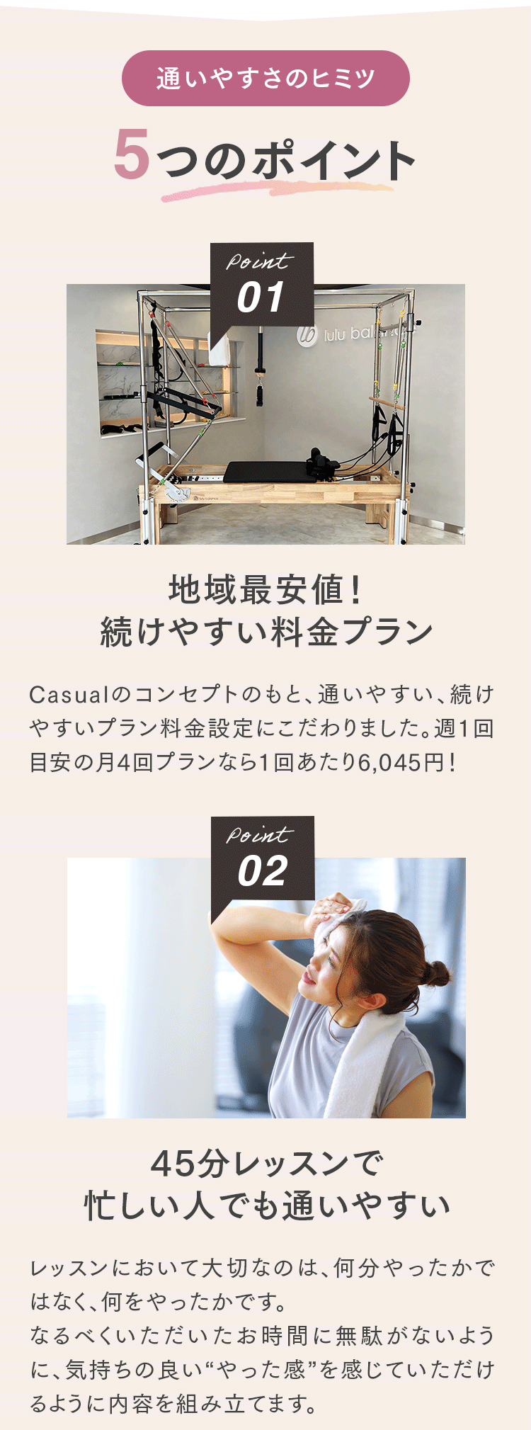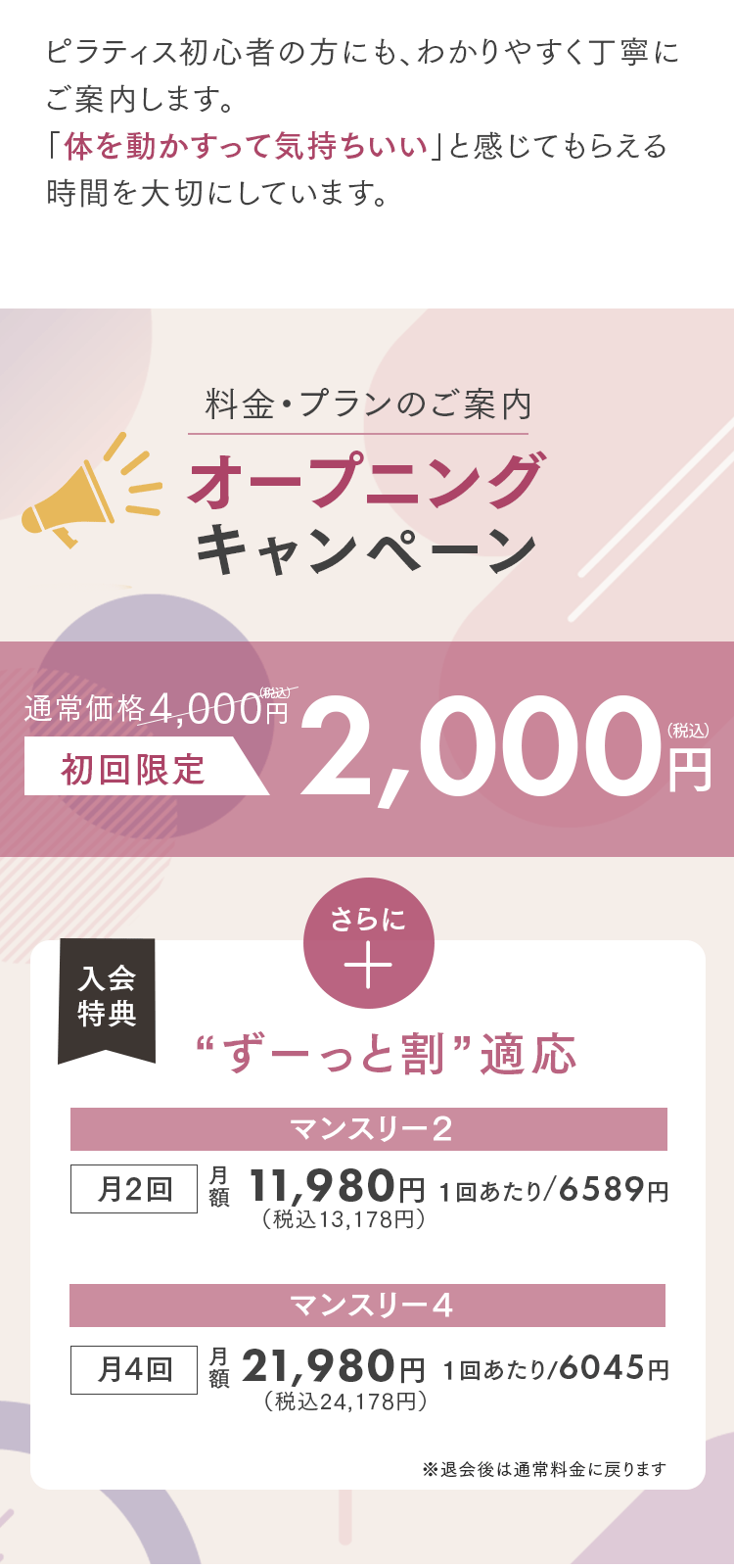 アクセス 芦花公園店 芦花公園駅1分。私らしく続けられる女性のためのマシンピラティス 住所:世田谷区南烏山1-30-3 1F 調布駅中央口1分 FAQ よくある質問 Q, マシンピラティスは初心者でもできますか? A, はい、ピラティスは初心者から上級者まで、年代含め幅広くご利用いただけます。専用のマシンを利用することで負荷なども調整可能ですので、安全にエクササイズを行うことができます。1つ1つの動きの中で経験豊富なインストラクターがサポートします。 Q, どのくらいの頻度でクラスを受けても大丈夫ですか? A,一般的に推奨されているのは週2回ペースですが、長く続けていただきたいという想いがあるので、まずは週1回からスタートしていただくのが良いかと思います。たくさん通いたい場合は追加チケット購入で週2回通うことも可能ですし、忙しくて毎週通うのが難しい方に向けて、月2回プランもご用意しております。無理ないペースで長く続けていただくのが大切と考えています。 Q, 体が硬いのですが、大丈夫ですか? A, そんな方こそご利用いただきたいです!ピラティスは柔軟性を高めるのにとても非常に効果的なエクササイズです。しなやかで、ヘルシーなカラダを目指しましょう! Q, 予約はどのようにできますか? A, ホームページの予約ページからいつでもご予約可能です。事前にチケットご購入の上、お好きな時間を選んでご予約ください。 Q, キャンセルポリシーはありますか? A, はい、キャンセルはご予約日、前日23:59まで可能です。それ以降のキャンセルではチケットが消化されますので、ご注意ください。 Q, 健康上の問題がある場合、参加できますか? A, 事前に医師にご相談し、インストラクターに現在の健康状態をお知らせください。ホームページ問い合わせからご連絡ください(LINEかメール)
